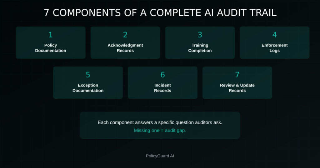 What should be in an AI audit trail? A complete audit trail includes: policy documentation with version history, employee acknowledgment records, training completion logs, enforcement evidence, exception documentation, incident records, and review/update records. Each component answers a specific question auditors ask.