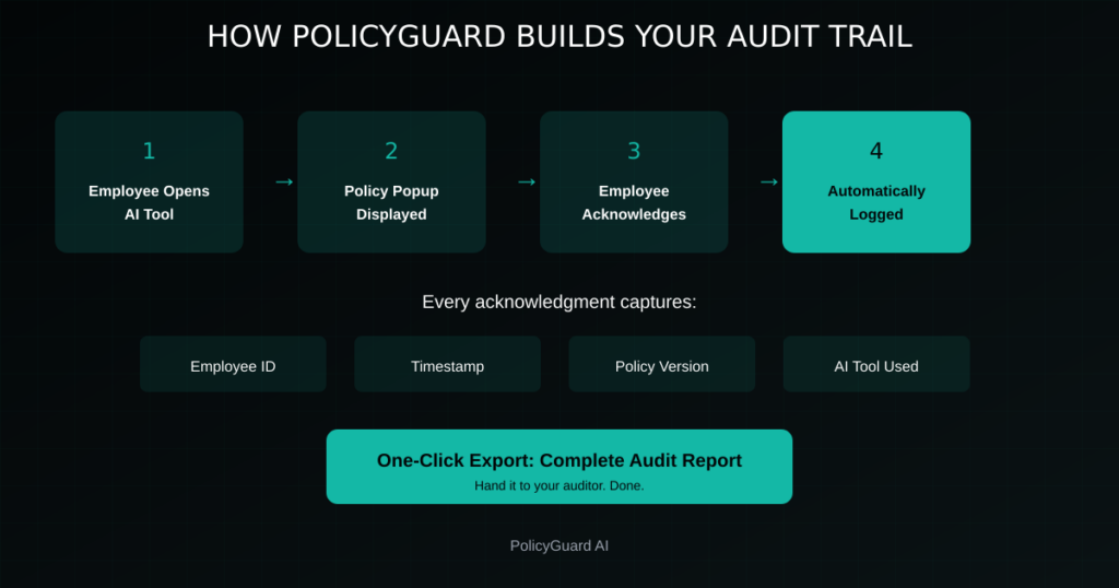 PolicyGuard was built specifically to generate the audit trail documentation regulators and auditors require.